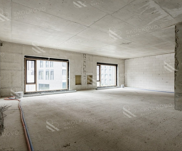 Планировка квартиры включает в себя кухню, объединенную с гостиной (43 кв. м.), две спальни (17,5 и 13,5 кв. м.), 2 санузла. Потолки высотой 3,2 метра делают пространство квартиры визуально более просторным.