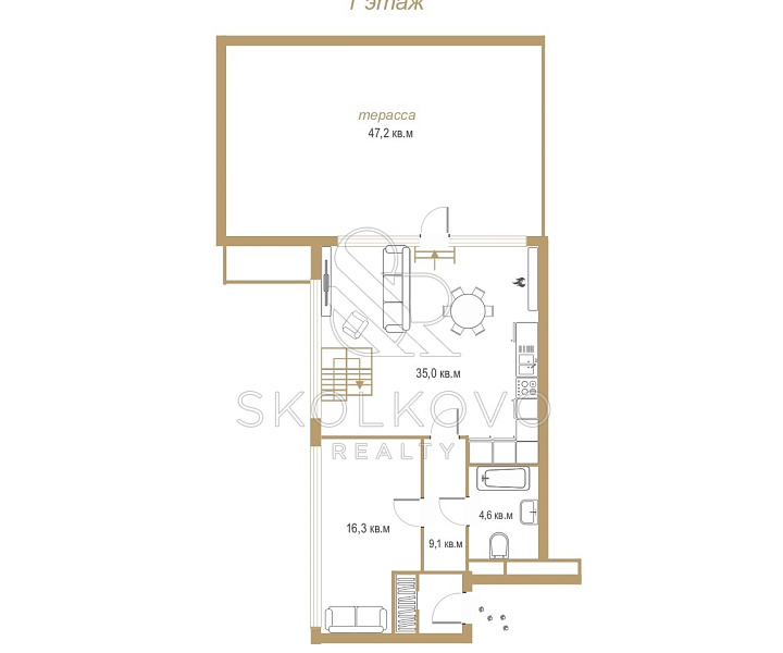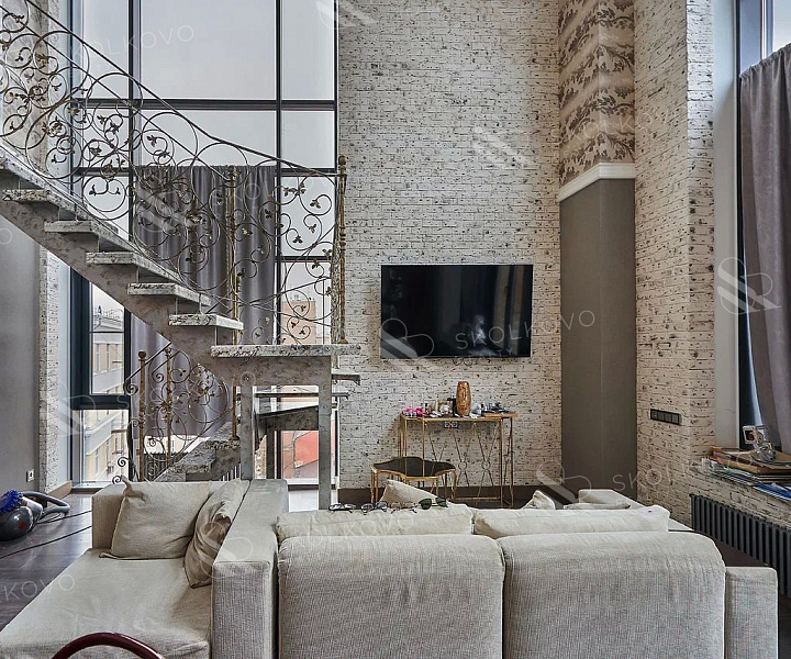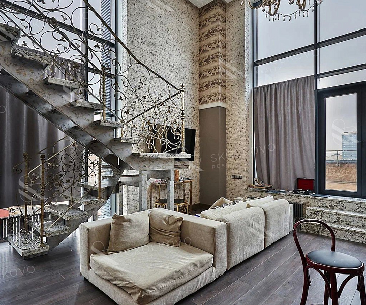 Конфигурация: двухуровневые апартаменты площадь - 151 м2 с выходом на собственную камерную террасу и эксплуатируемую кровлю! Высота потолков в гостиной 6 метров!