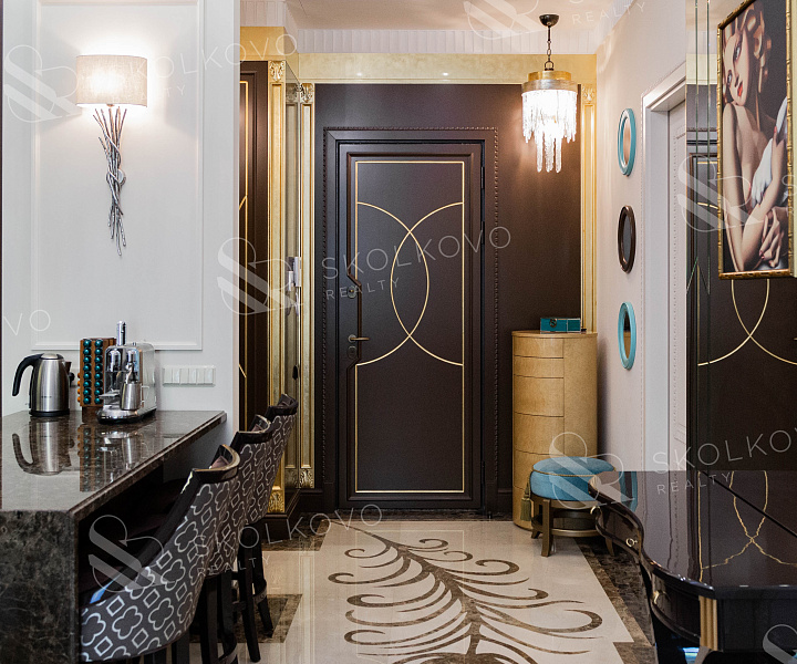Дизайн квартиры, мебель, освещение, декор и аксессуары спроектированы и произведены в Италии, подоконники из натурального мрамора, двери из массива древесины, тщательно разведенная и продуманная система кондиционирования, приточно-вытяжная вентиляция помещений и теплый пол, установленный по всей квартире.