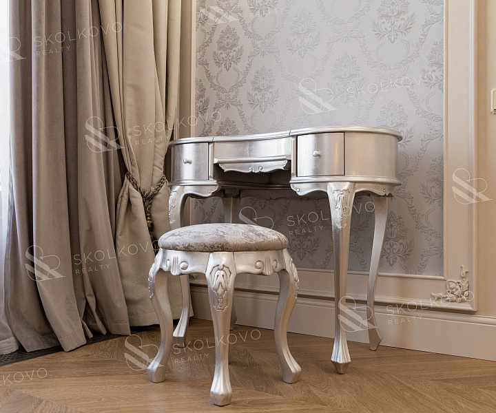 В спальне - паркетная доска, продуманная система хранения, резной потолок ручной работы, стены, декорированные натуральным шелком и вставками из зеркал, которые изящно расширяют пространство комнаты.