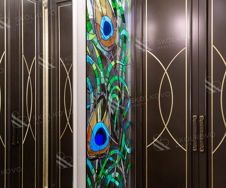 Холл - вместительные шкафы с золотым рисунком, с постирочным отсеком внутри.