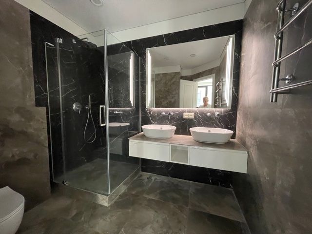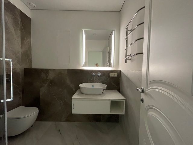 Выполнен дизайнерский ремонт в современном стиле из натуральных материалов.