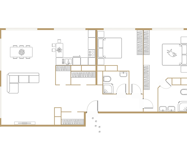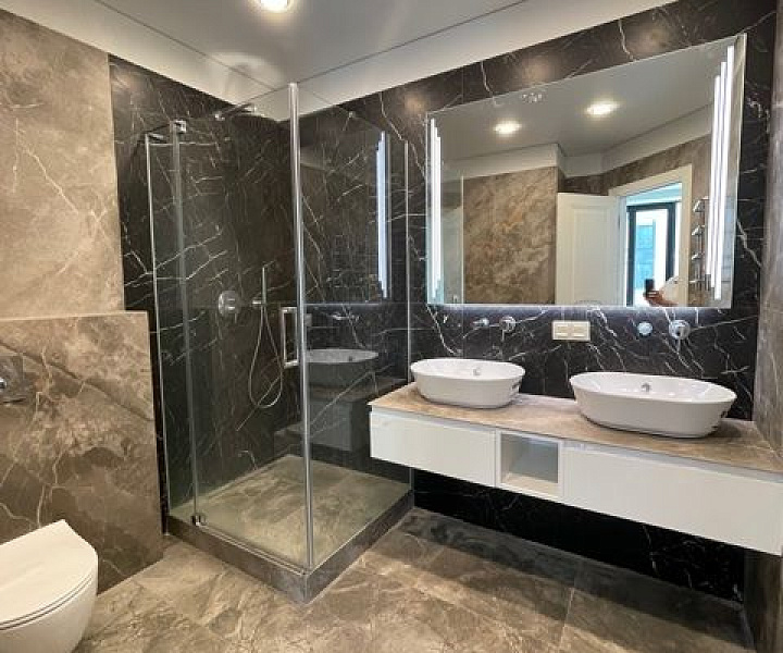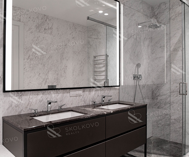 Планировка: кухня объединенная с гостиной, мастер-спальня с санузлом, детская комната, гостевой санузел с душевой. В апартаментах имеется высококачественная мебель и бытовая техника, работают системы кондиционирования и вентиляции. Качественные отделочные материалы(см. фото).