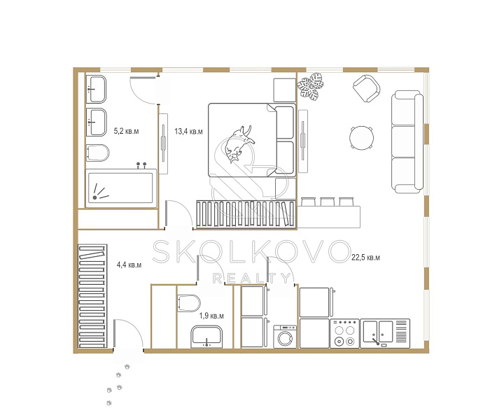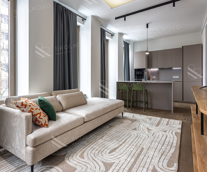 Удобное и функциональное планировочное решение включает в себя мастер-спальню с санузлом, гардеробную, постирочную и кухню, объединённую с обеденной зоной и гостиной. Окна квартиры выходят на север, что обеспечит вас светом в течение всего дня и открывает прекрасный вид во двор и улицу.