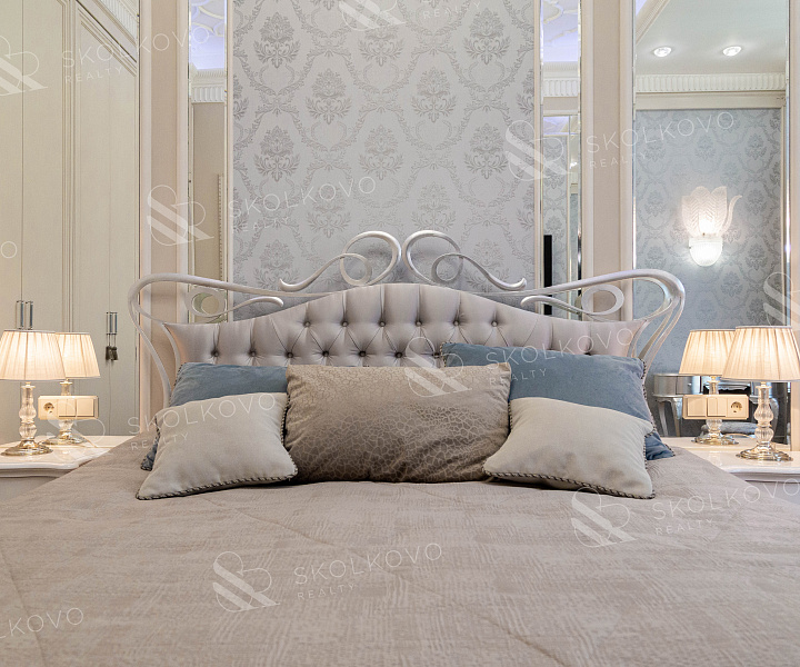 В спальне - паркетная доска, продуманная система хранения, резной потолок ручной работы, стены, декорированные натуральным шелком и вставками из зеркал, которые изящно расширяют пространство комнаты.