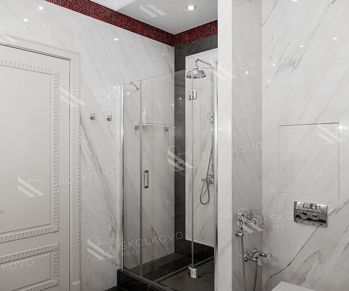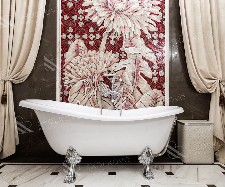В мраморной ванной комнате, эстетическим центром которой является мозаичное панно ручной работы, выполненное по специальному заказу из ценных пород камней, эксклюзивная сантехника, телевизор напротив ванной, декор, все необходимые аксессуары.