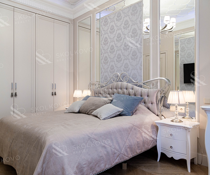 В спальне - паркетная доска, продуманная система хранения, резной потолок ручной работы, стены, декорированные натуральным шелком и вставками из зеркал, которые изящно расширяют пространство комнаты.