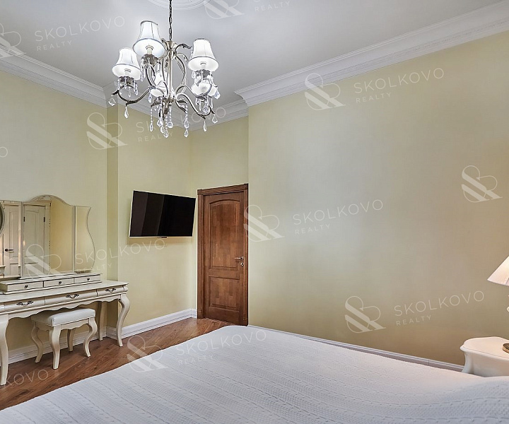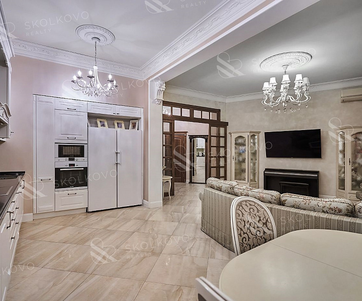 Квартира оформлена в классическом стиле с использованием высококачественных материалов, что подчеркивает изысканность и элегантность интерьера.