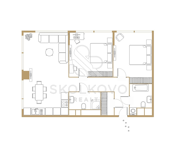 Планировка: кухня, объединенная с гостиной, 2 спальные комнаты, 2 полноценных санузла.
