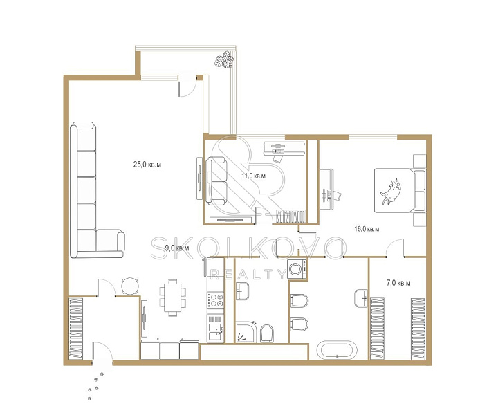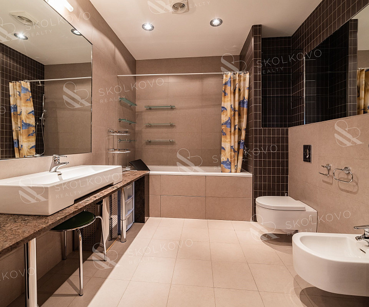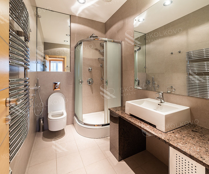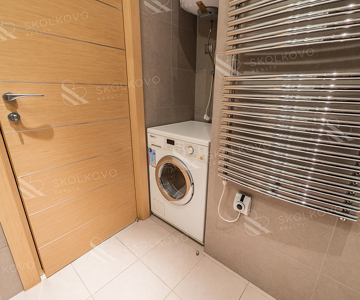 На кухне установлен современный кухонный гарнитур с встроенной техникой от немецкой компании MIELE. Для комфортного проживания предусмотрены полы с подогревом, скоростной интернет и спутниковое телевидение.