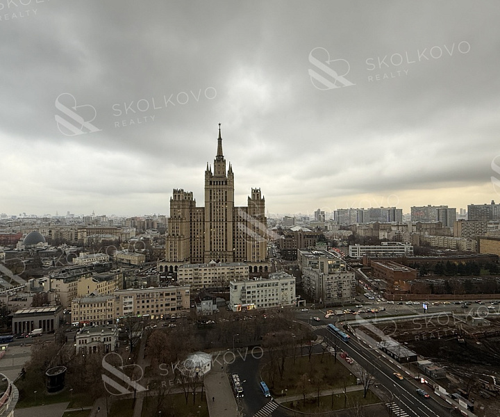 Просторная кухня-гостиная с великолепным панорамным видом на высотку на Баррикадной.