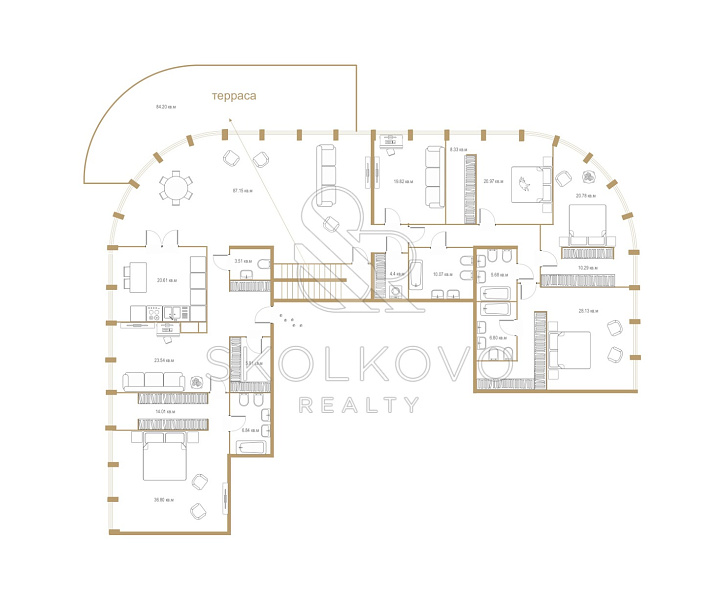 Свободная планировка позволяет создать идеальную конфигурацию пространства: просторная кухня-гостиная, шесть изолированных комнат, в том числе пять спален, кабинет и четыре санузла.