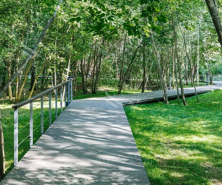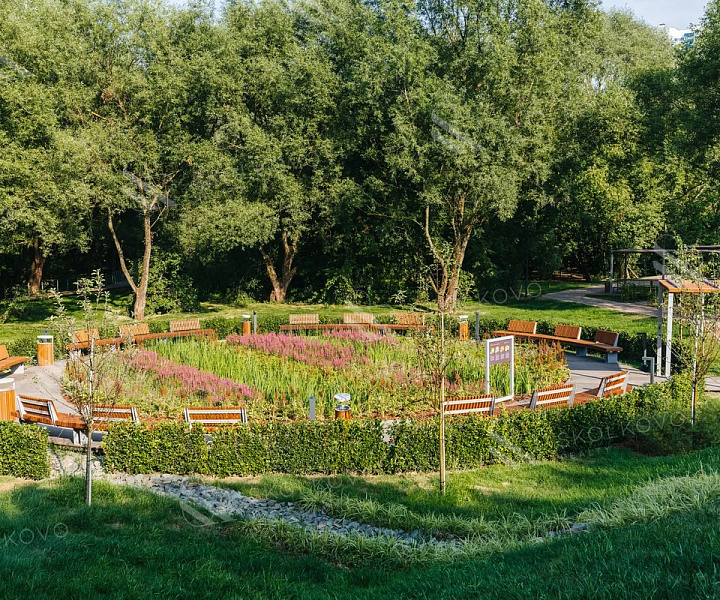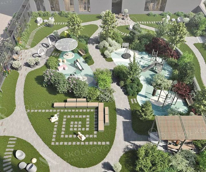 На крыше двухуровневого подземного паркинга расположен зеленый ландшафтный парк с лаунж-зонами, детскими и спортивными площадками.