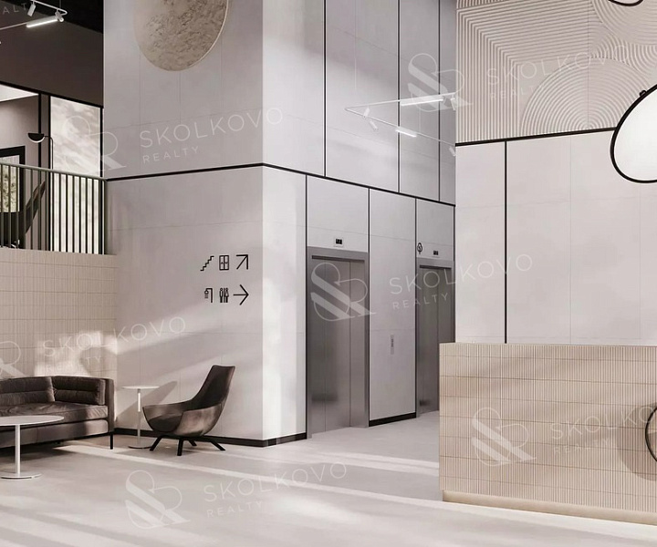 Архитектурное решение комплекса является гармоничным сочетанием нейтральных серых и белых тонов, украшенных графическими элементами, что придает зданию уникальность и современность.