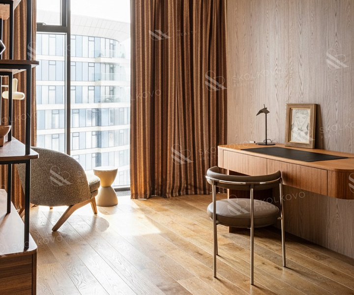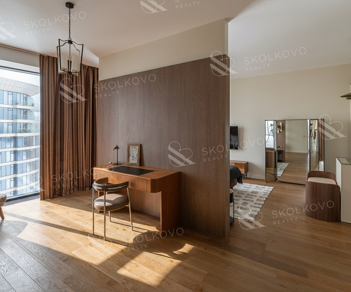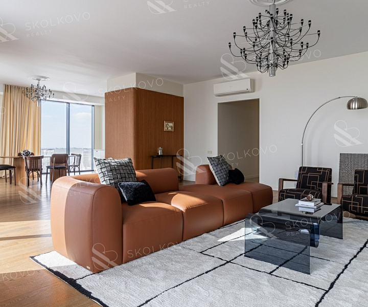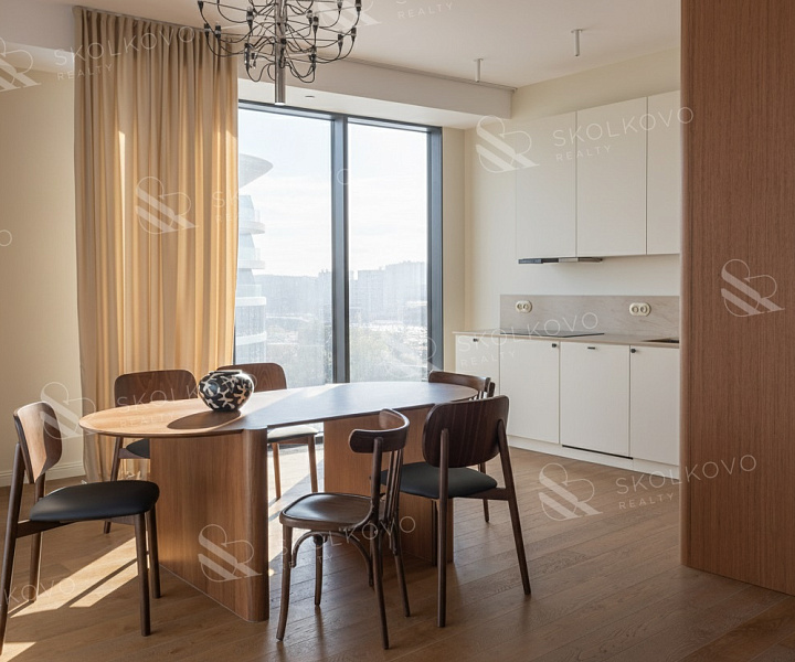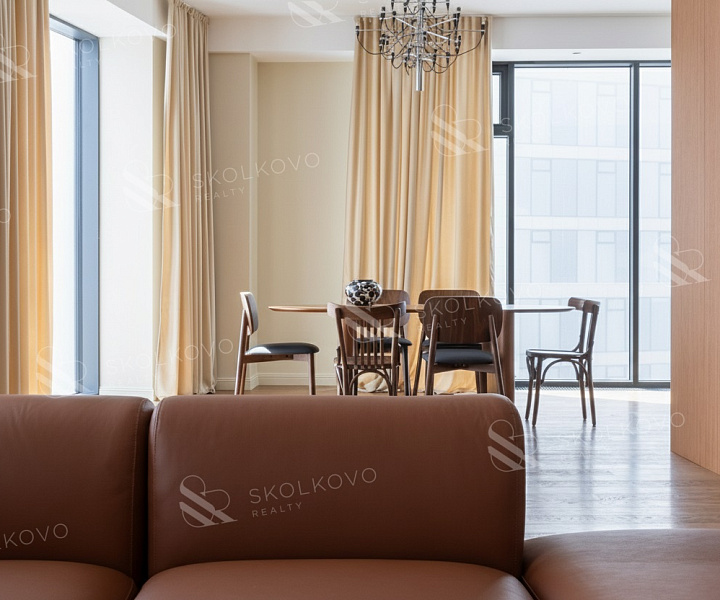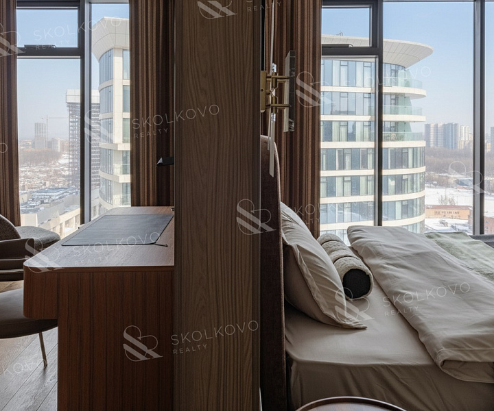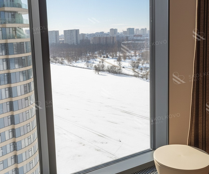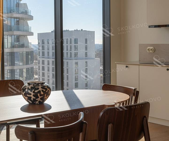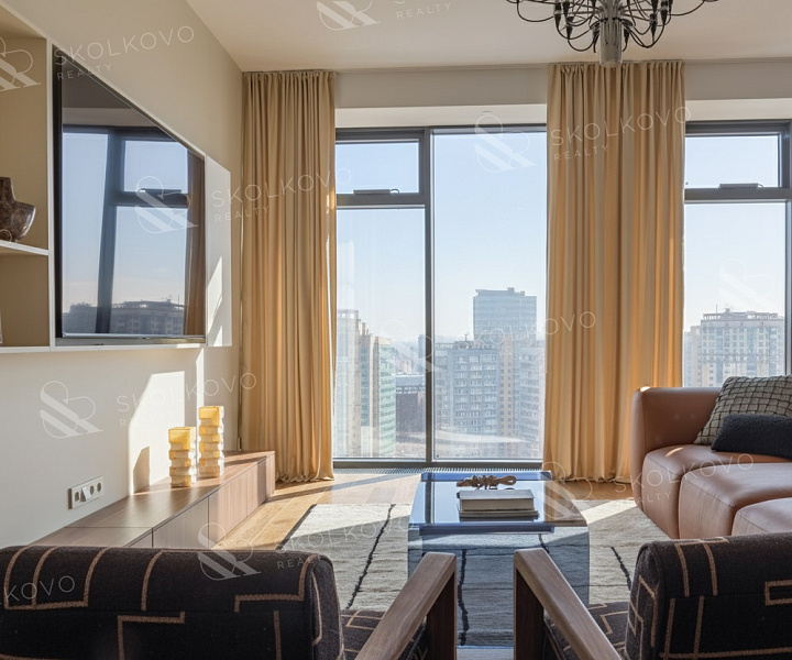 Расположение на высоком этаже открывает великолепные панорамные виды на Москву, наполняя пространство светом благодаря большому количеству окон.