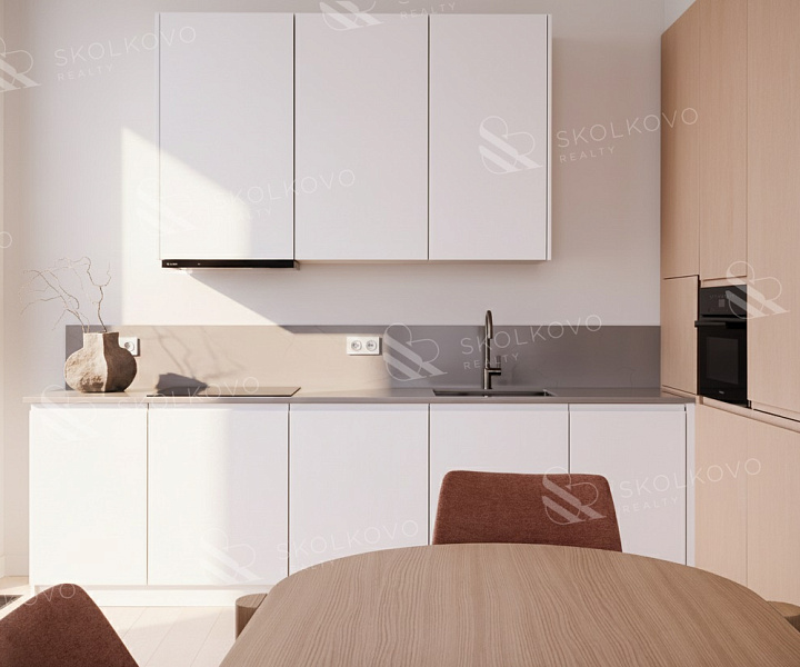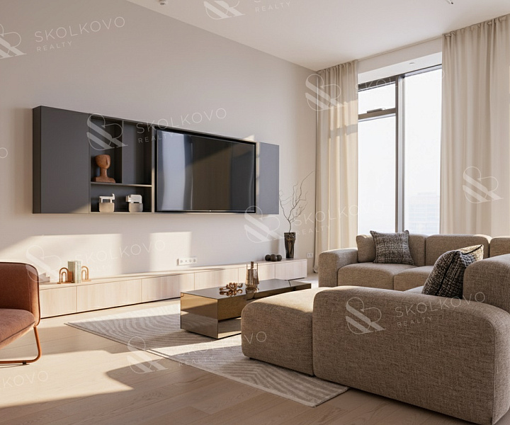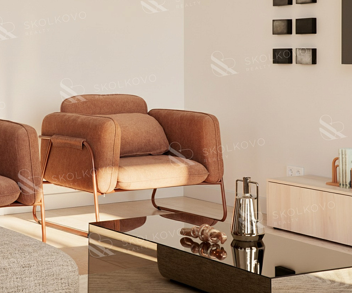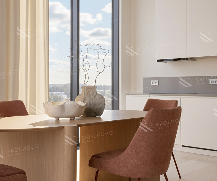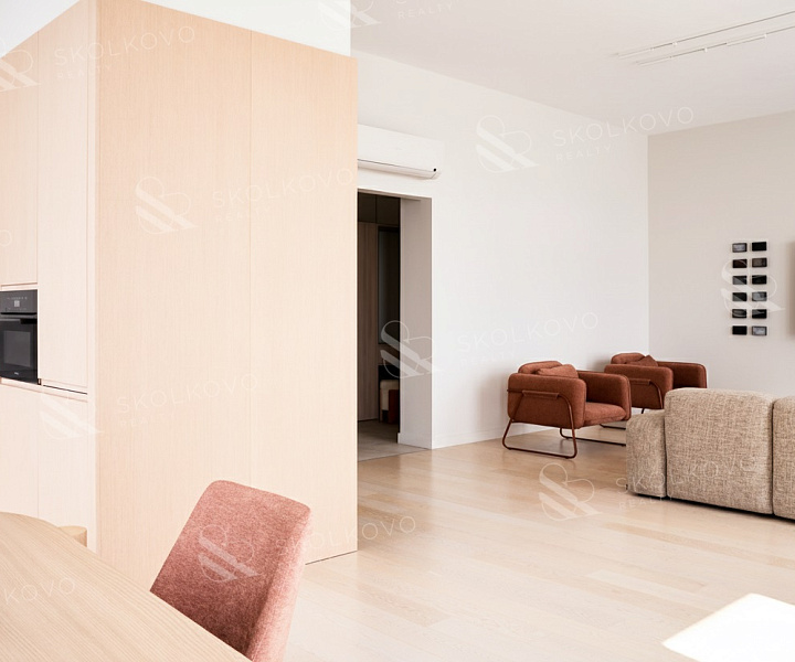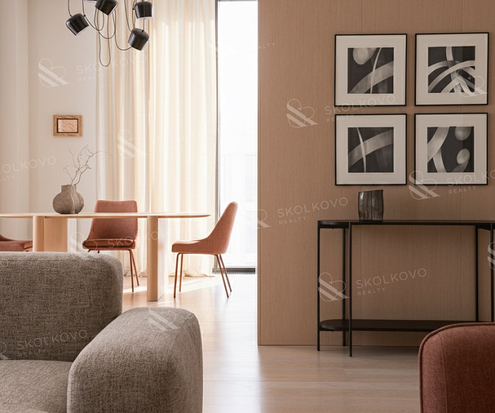 Сердцем квартиры является просторная гостиная со столовой зоной (40 м2 + 27 м2), которая плавно переходит в кухню, создавая открытую и светлую атмосферу.