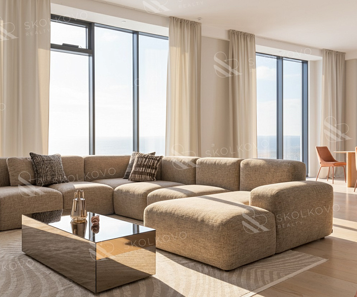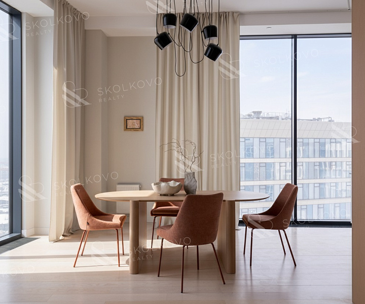 Просторное жилье с общим метражом 183 м² притягивает внимание благодаря современному дизайну, функциональной планировке и великолепным панорамным окнам, обеспечивающим потрясающие виды на канал имени Москвы и городские пейзажи.
