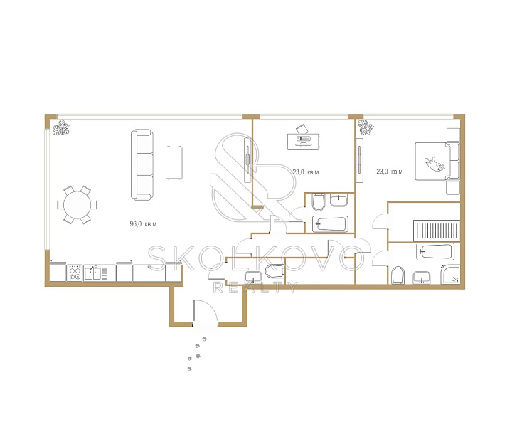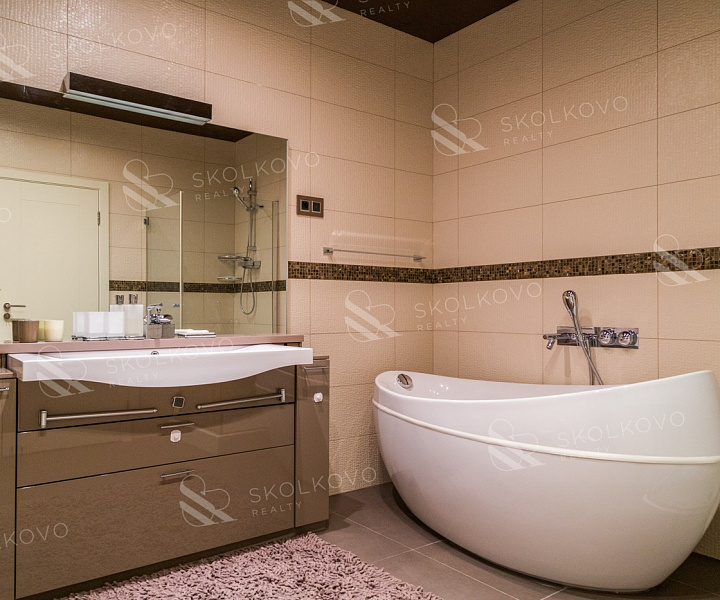 Просторные комнаты и функциональная планировка включают уютную кухню-гостиную, две спальни с отдельными санузлами, гостевой санузел и гардеробную.