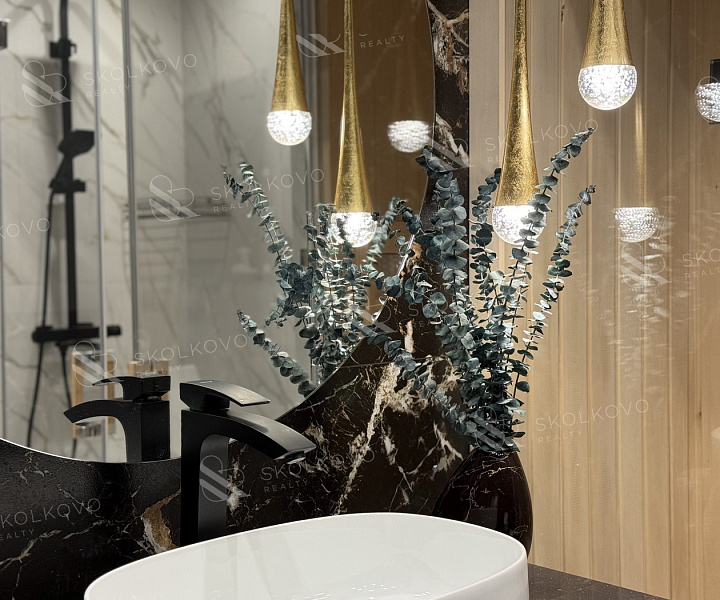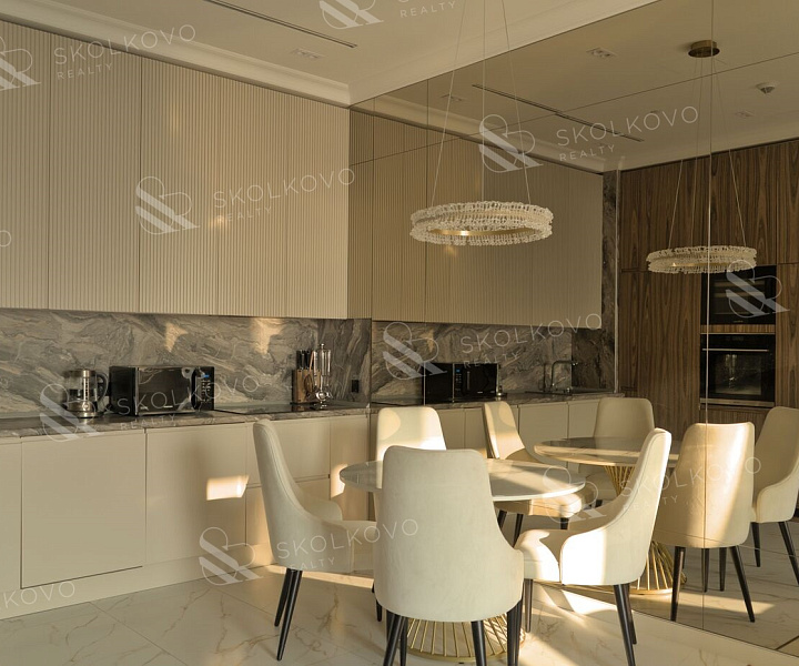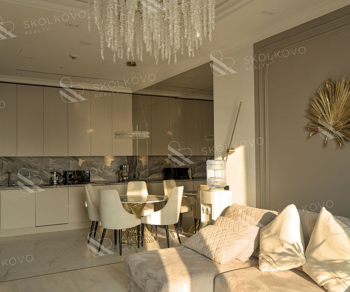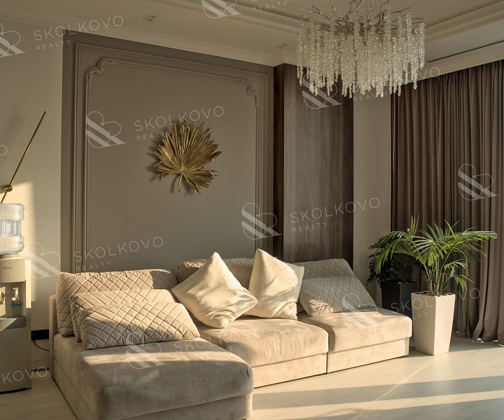 Пространство благодаря панорамным окнам и высоким потолкам наполнено естественным светом, создавая атмосферу гармонии и уюта.