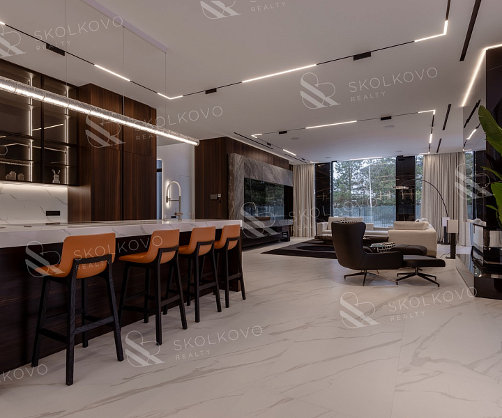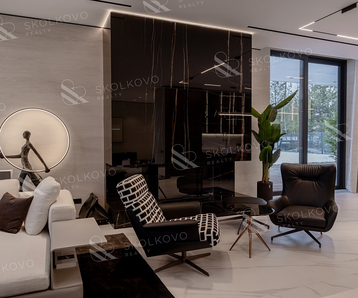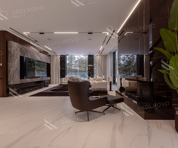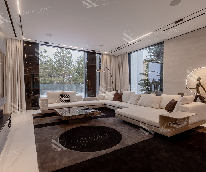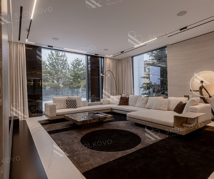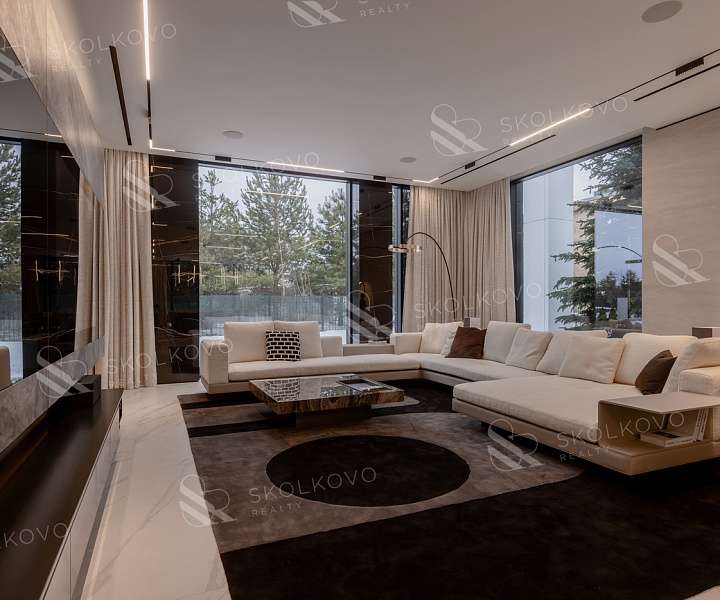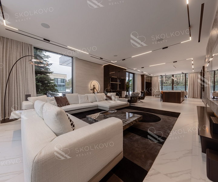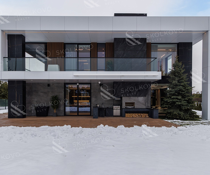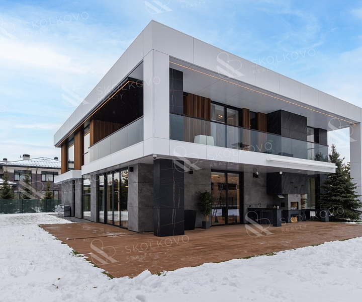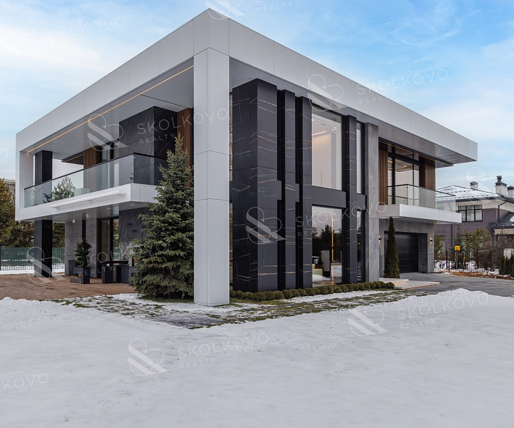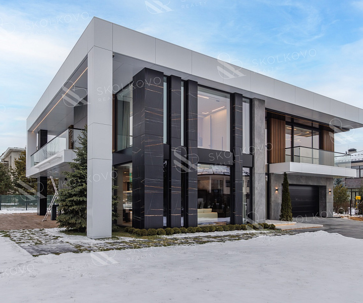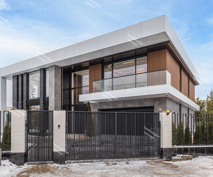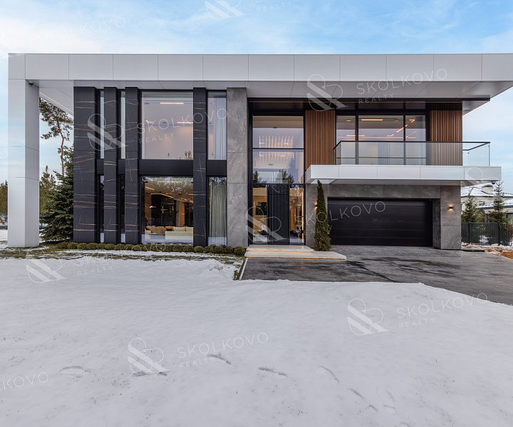 Дом в современном стиле пл. 573м2, с панорамными (высота 3,5м.) алюминиевыми окнами и плоской кровлей, вторым светом в тихой части поселка в тупике, с собственным въездом и парковкой на 14 авто в кп Ренессанс Парк.
