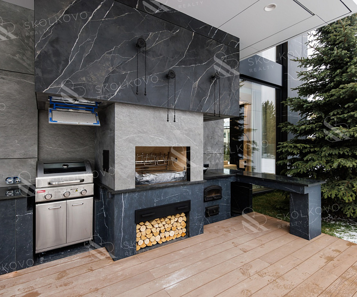 • летняя кухня с большой террасой, уличной аудио системой и маркизой.