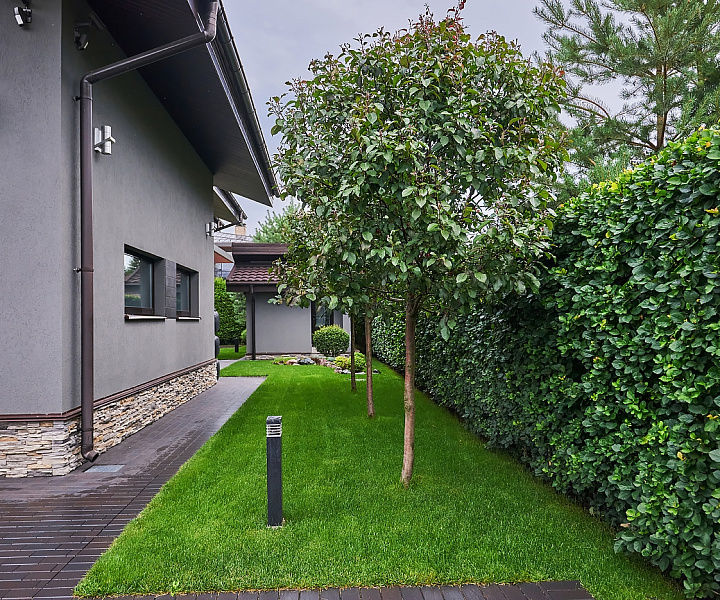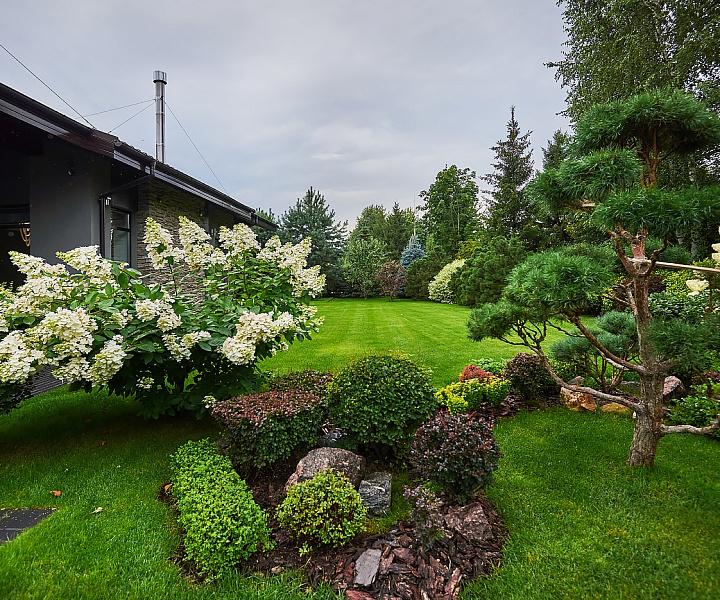 На участке проведены ландшафтные работы, высажены красивые деревья и кустарники. Кроме того, крупные-раскидистые деревья произрастают непосредственно за территорией участка, что создаёт незабываемую, уютную атмосферу.