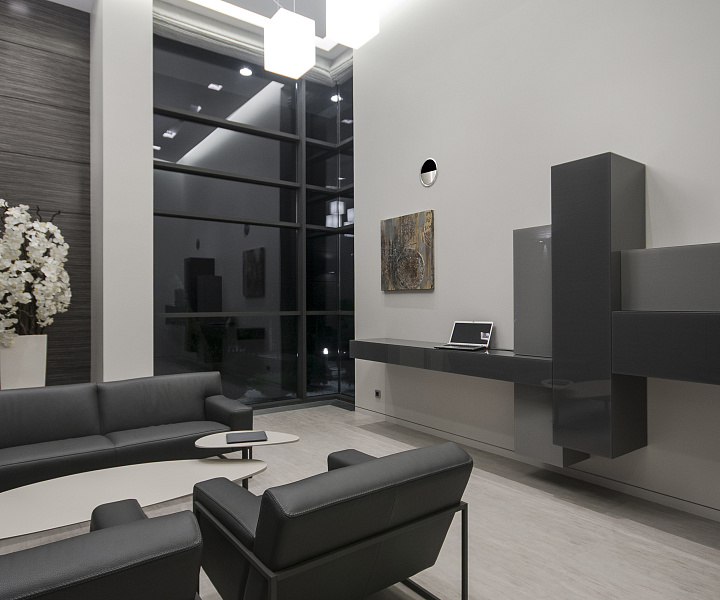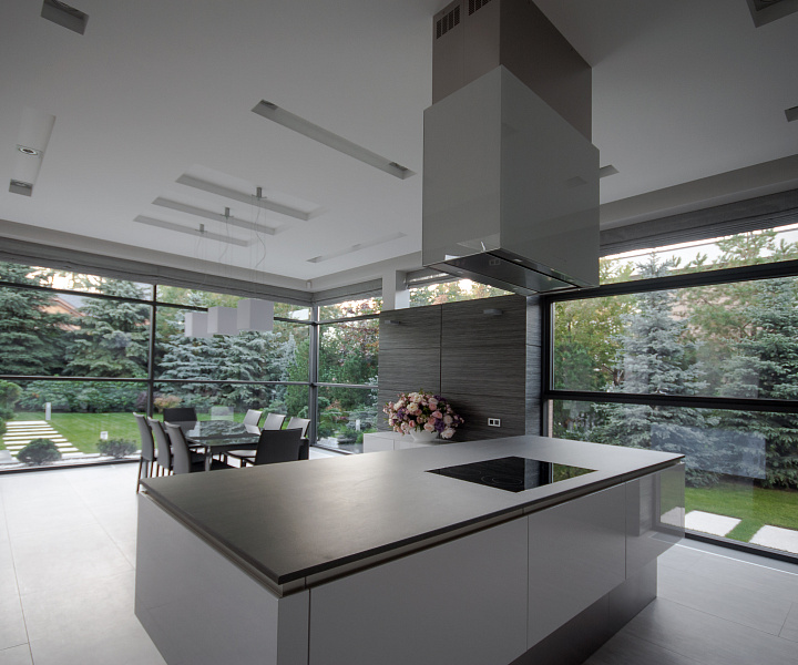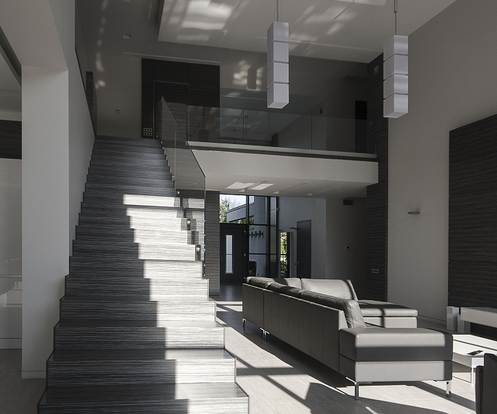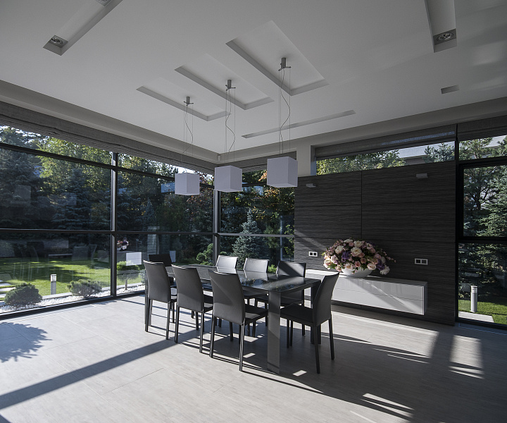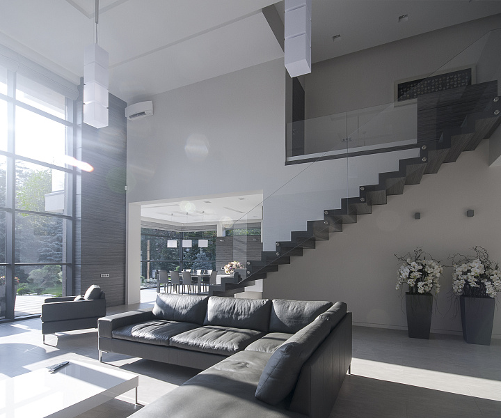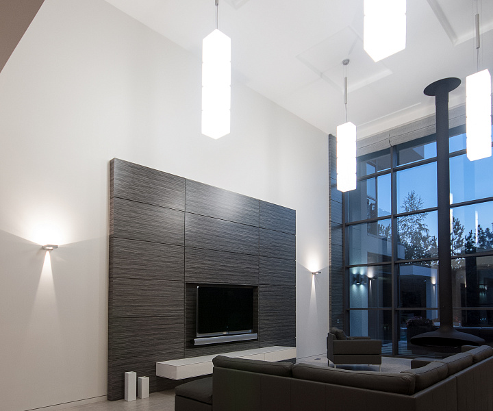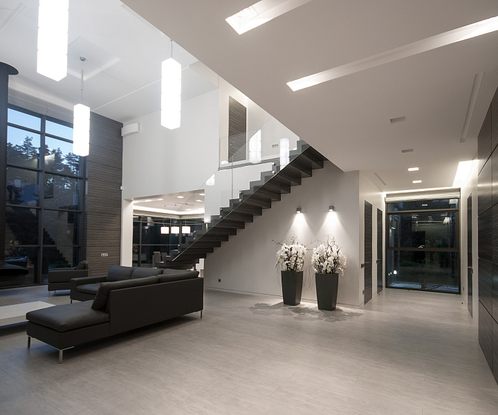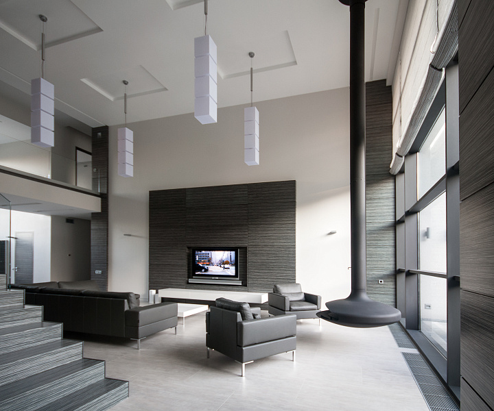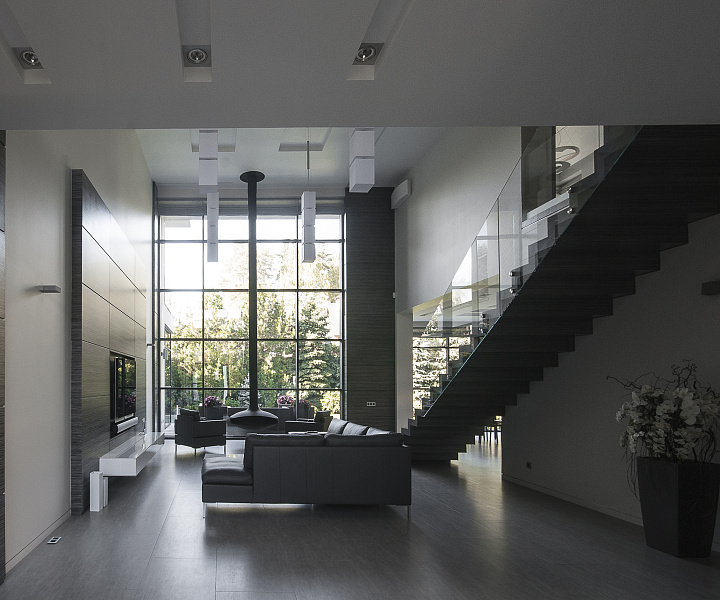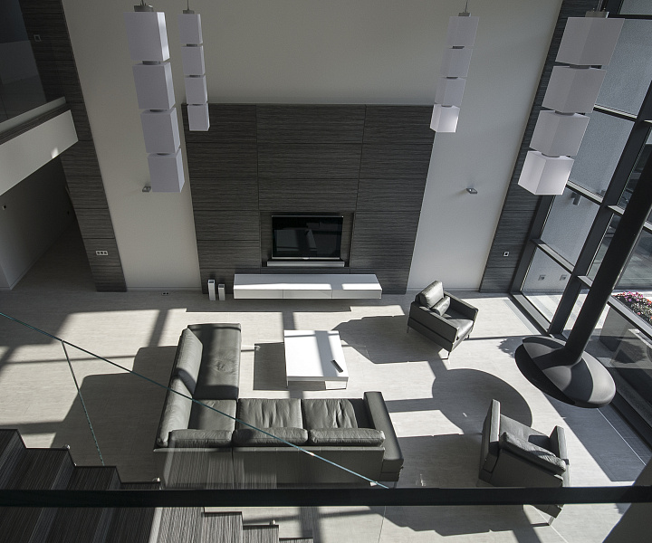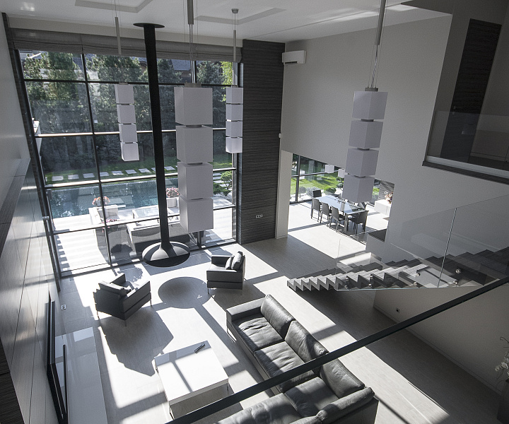 Современная концепция резиденции. Гостиная со вторым светом до 8 метров с панорамными видами на ландшафт , лес и открытый бассейн.