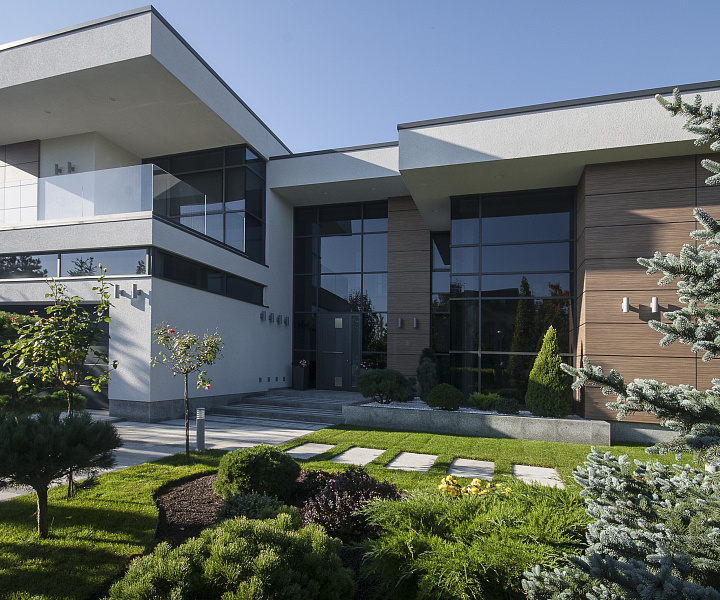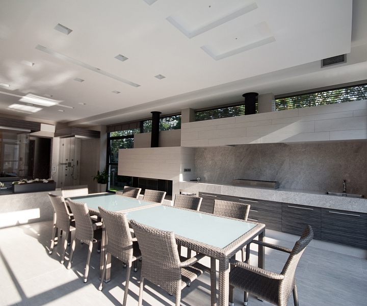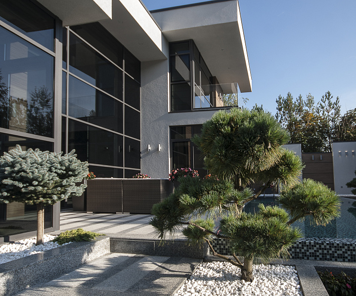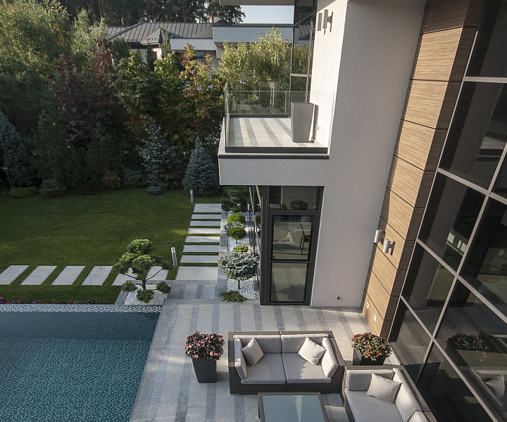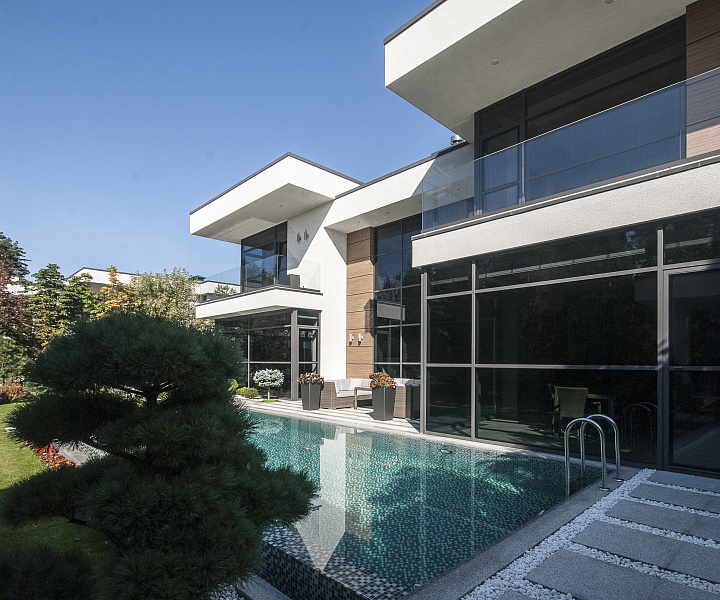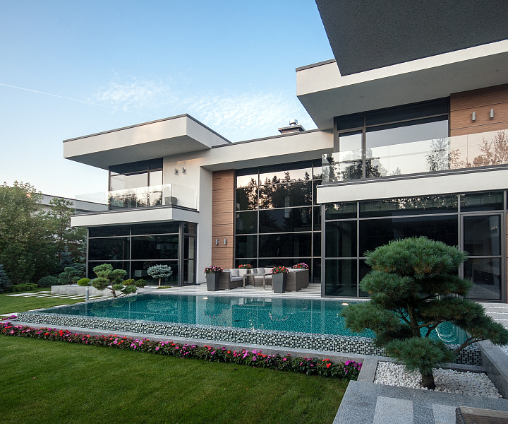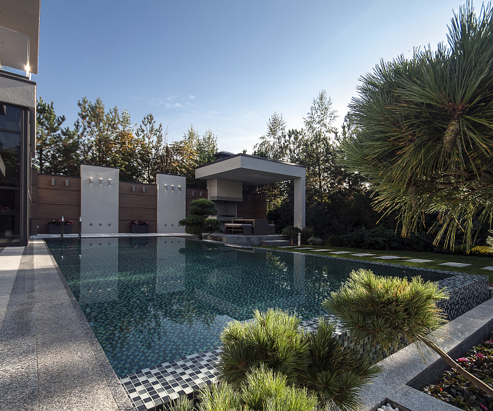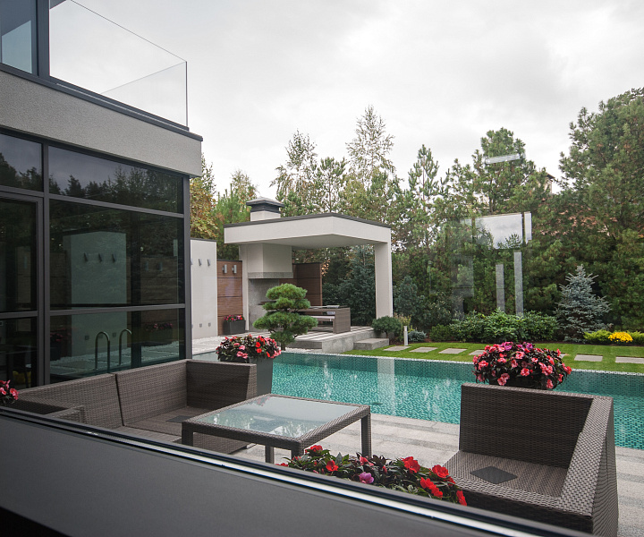 На участке выполнен профессиональный ландшафтный дизайн и расположен открытый бассейн. Предусмотрена зона барбекю.