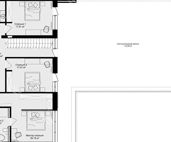 Две дополнительные спальни, каждая с выходом на просторную видовую террасу, откуда открывается захватывающий вид на окрестности.