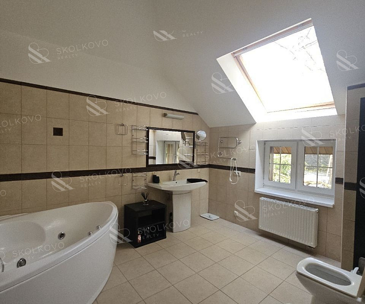 Большой санузел с джакузи, в котором можно расслабиться и восстановить силы. Все спальни и ванная комната оборудованы мансардными окнами Velux, что создает особую атмосферу.