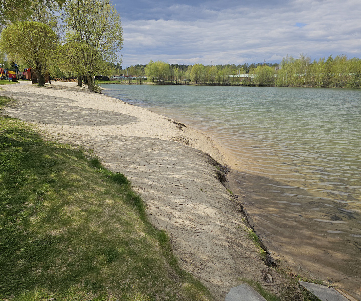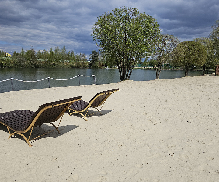 Собственный песчаный пляж на берегу озера для отдыха и красивый парк для прогулок на свежем воздухе.