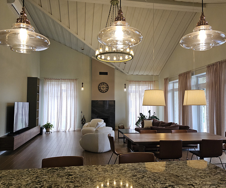 Коттедж построен в стиле современной классики с высокими потолками и панорамными окнами, что позволяет наполнить дом светом и создает ощущение простора.