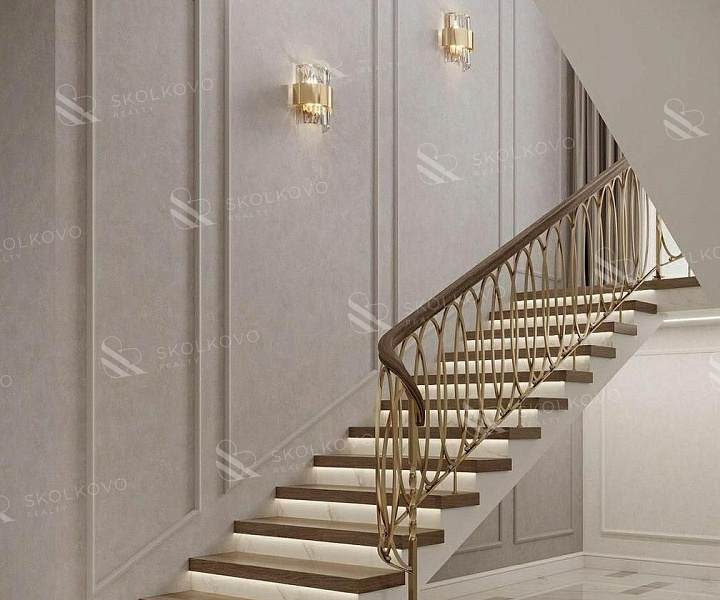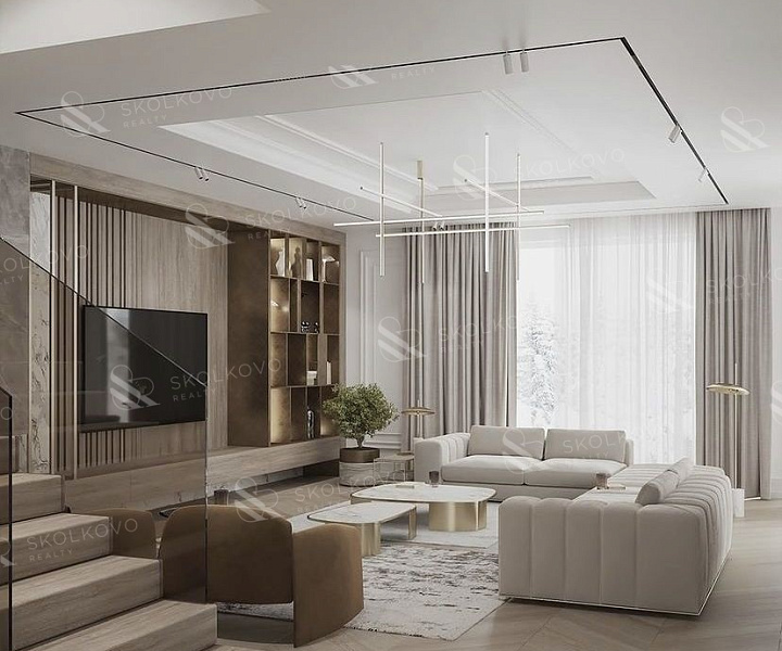 Этот стильный коттедж в архитектуре, вдохновленной Райтом, расположен в сердце охраняемого коттеджного поселка Новорижский, всего в 23 км от МКАД.
