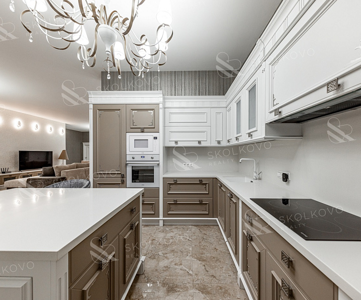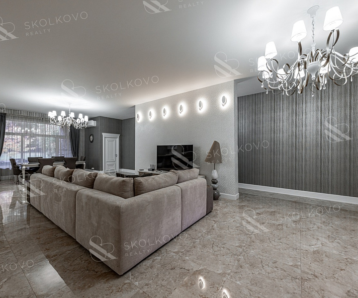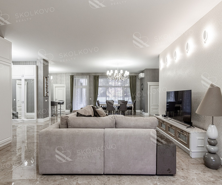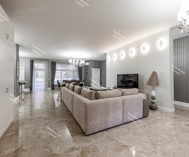 Просторная гостиная, объединённая с кухней и столовой (95 м²) — идеальное место для семейных встреч и вечерних ужинов.