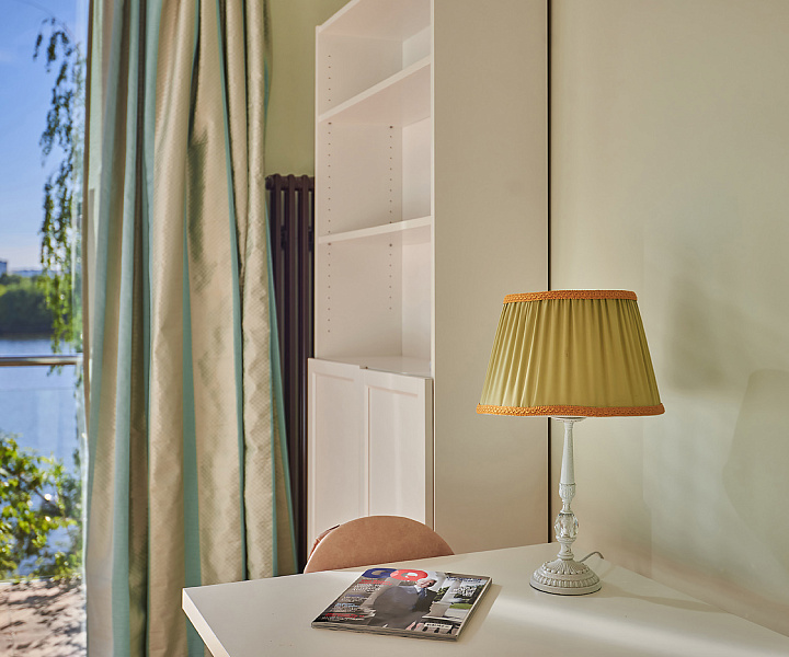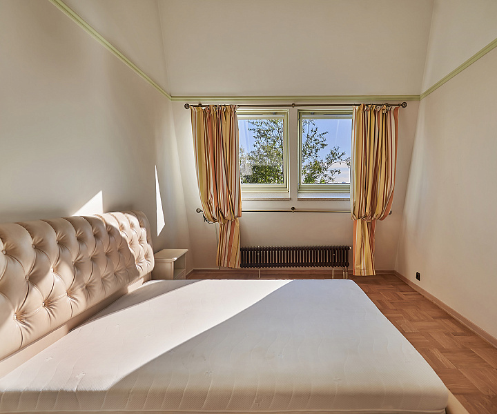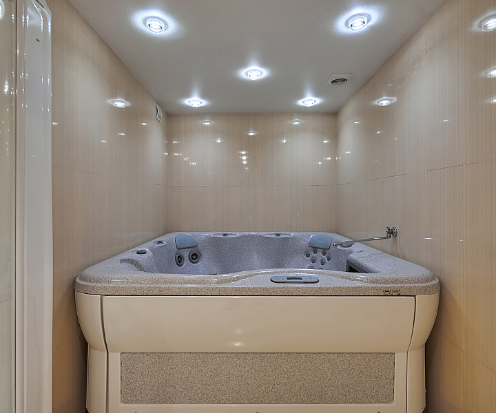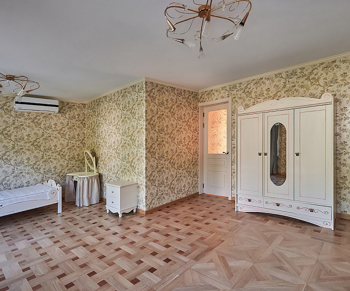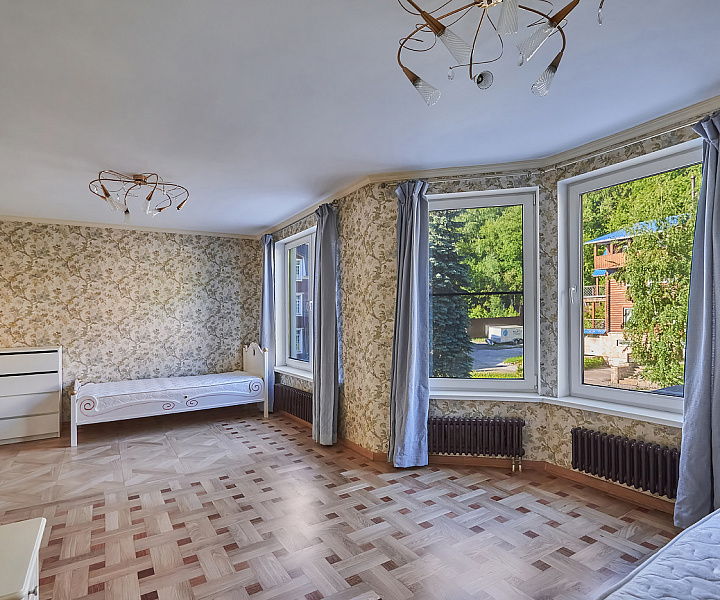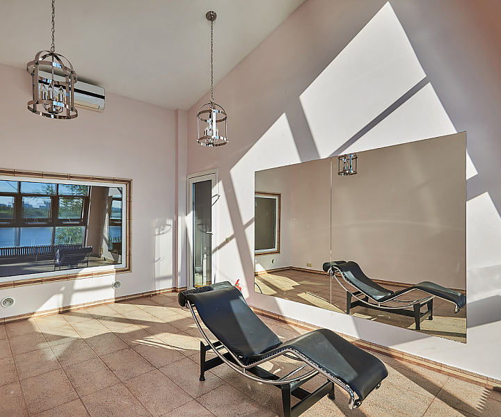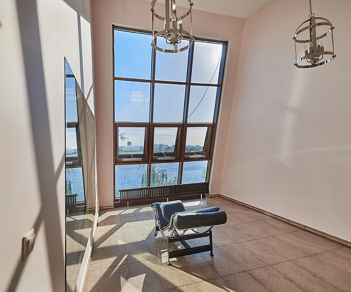 Планировочное решение: 1-й уровень (цоколь): санузел, джакузи, сауна, постирочная, зона для отдыха; 2-й уровень: гостиная, санузел, кухня, гардеробная; 3-й уровень: три спальни, санузел; 4-й уровень: три комнаты свободного назначения и санузел. На мансардном этаже расположена комната свободного назначения с панорамными окнами.