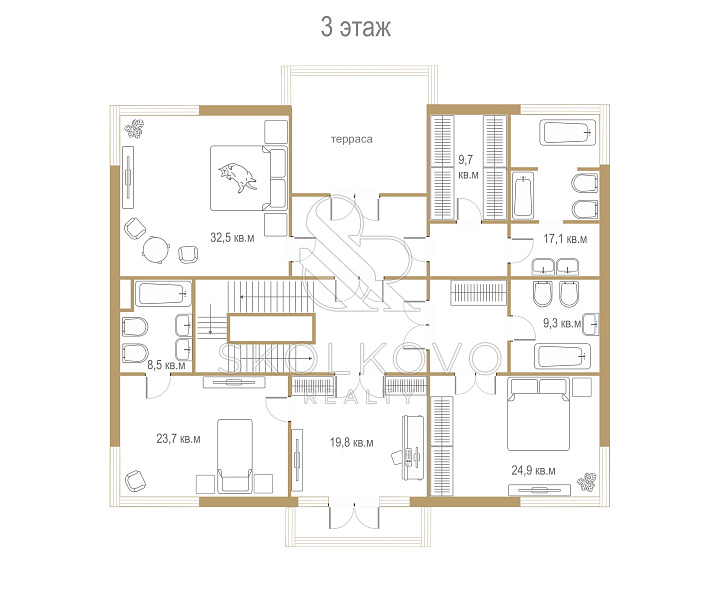 Виллы расположенные в самом сердце Серебряного Бора на первой линии у воды, служат живым воплощением желаний о красивой жизни в столице. Просторная вилла со вторым светом площадью 850 квадратов с учётом цоколя и тремя этажами. Планировка включает 5 просторных мастер-спален, 3 из них с гардеробными, холл со вторым светом, 8 санузлов, кабинет, игровые, шикарная терраса, шеф-китчен и балкон. Конечно, вид на Москву-реку, приватный зеленый участок, обустроенная эксплуатируемая кровля на крыше дома.