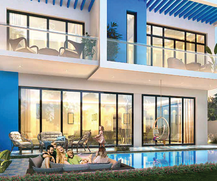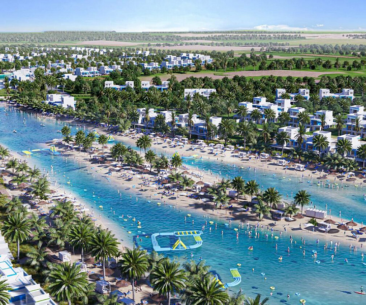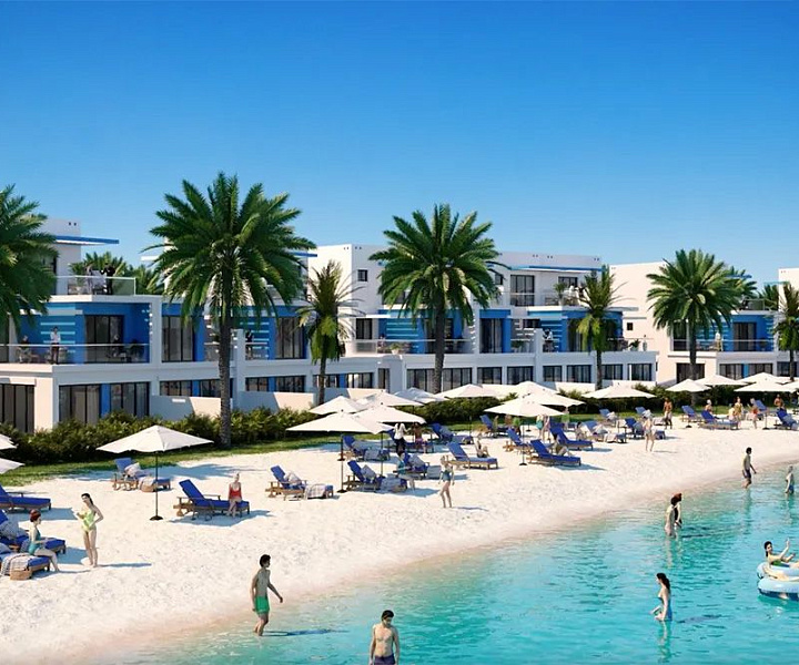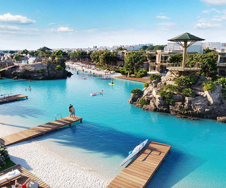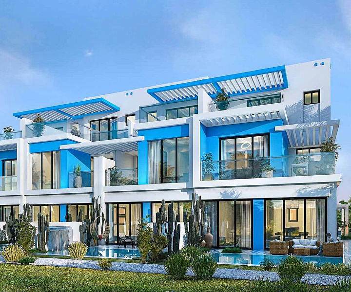 id: 546252 Санторини – шикарные таунхаусы и виллы с белоснежными фасадами и голубыми штрихами, напоминающие типичные средиземноморские мотивы и окруженные красотой лагун ДАМАК.