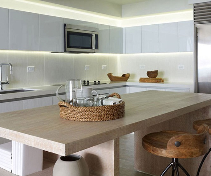 • Дизайнерские кухни с встроенной подсветкой по проекту Деборы Агиар (Debora Aguiar) изготовлены компанией Italkraft. Техника из нержавеющей стали марок Sub Zero и Bosch, фурнитура Grohe и раковины Kohler